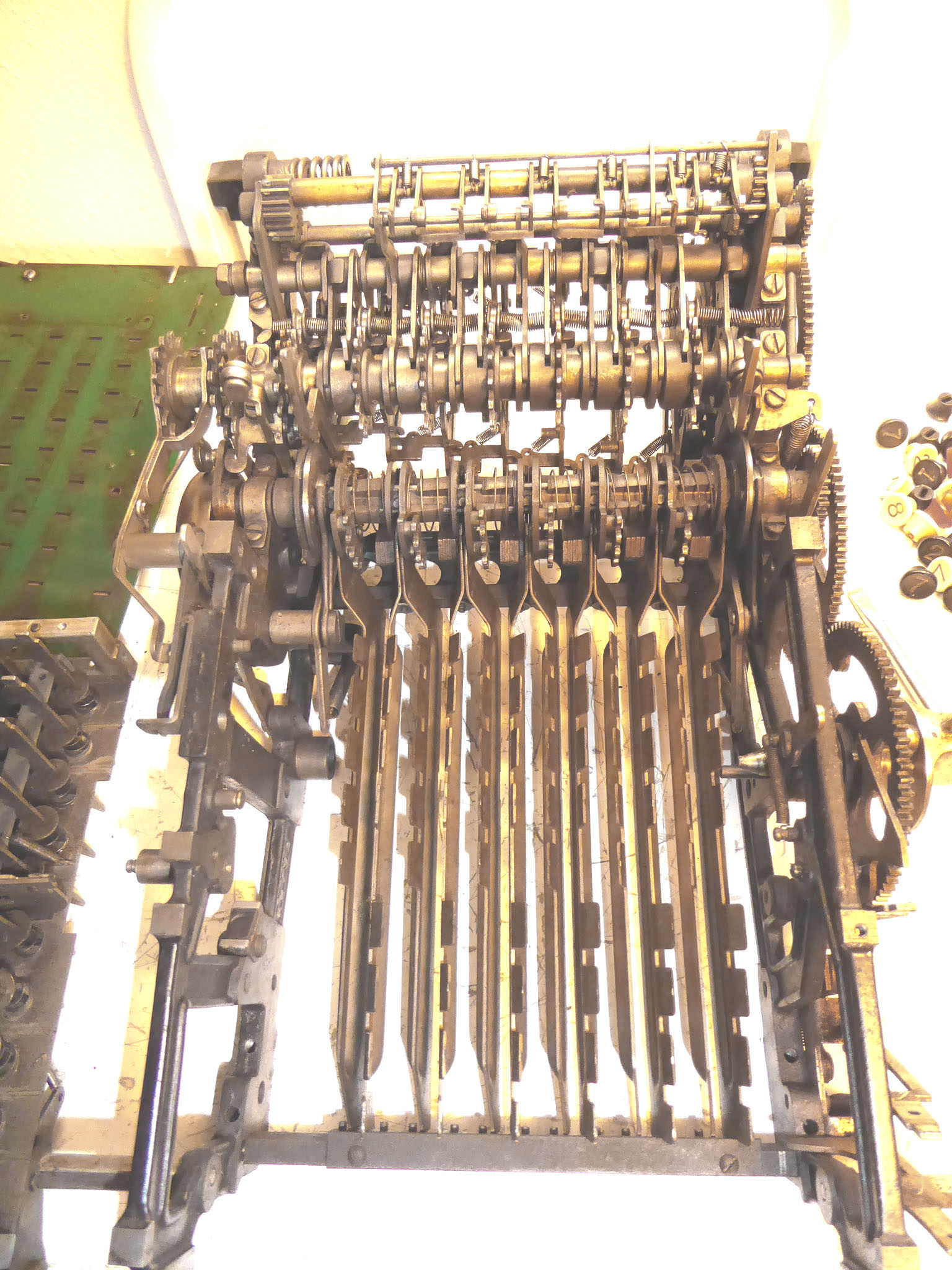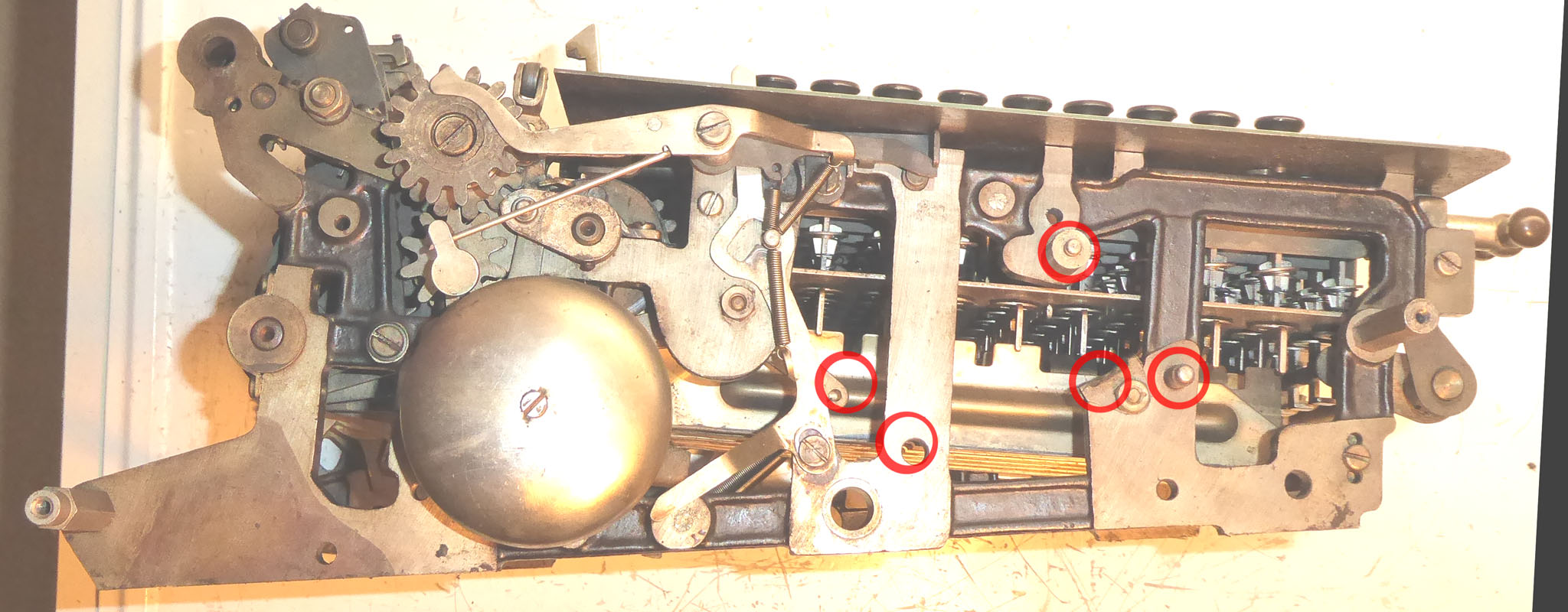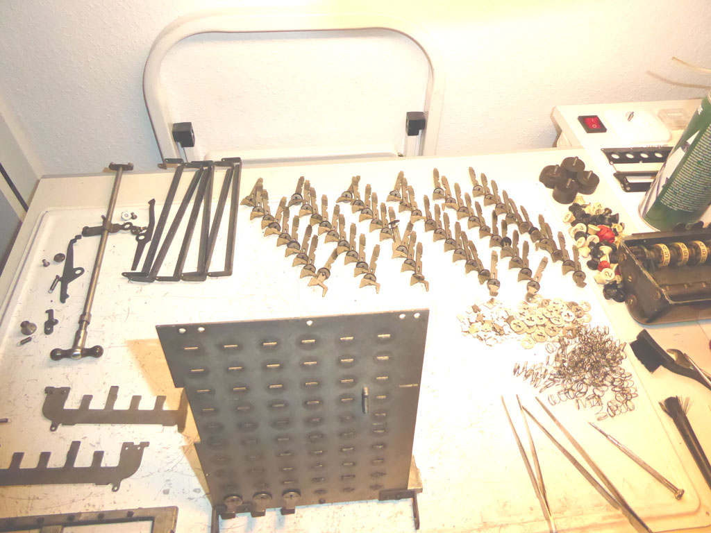 Feder der RW-Löschung eingehängt, defekte Rückdrehsperre neu gesplintet, Ziffern im ZW neu eingelegt, unpassende Schraube der ZW-Löschkurbel ersetzt, Stifte der Kommastecker nachgearbeitet, vergraute Pappe unter dem Glas ersetzt. Im Holzkasten, mit Schlüssel und vier Kommasteckern. Französische Anleitung im Netz gefunden. |