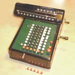 Was gehört zu dieser Gruppe?Nicht immer waren große, teure Rechenmaschinen nötig, oft konnte man sich auch keine leisten. Dann benutzte man entweder einfache Rechenhilfen aus der vorigen Gruppe oder die hier versammelten kleinen Maschinen, deren gemeinsames Merkmal das Resultatwerk mit echtem Zehnerübertrag ist. |
